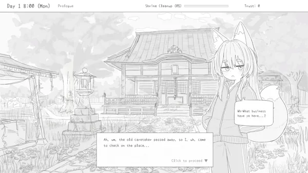 上一个看守人去世后,你将继承清理当地神社的责任。当你遇到毛时,开始是一件简单的家务,很快就变成了一次迷人的经历。毛是一个害羞可爱的狐狸女孩,她把神社称为自己的家。与人类隔离多年后,她最初很警惕,但很感激你致力于修复她的避难所。